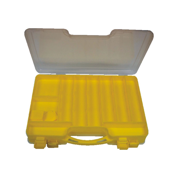 Κασετίνα ψαρέματος με χωρίσματα για οριζόντια διάταξη. Η κασετίνα διαθέτει δύο επίπεδα (πάνω και κάτω) και ανοίγει και από τις δύο πλευρές.